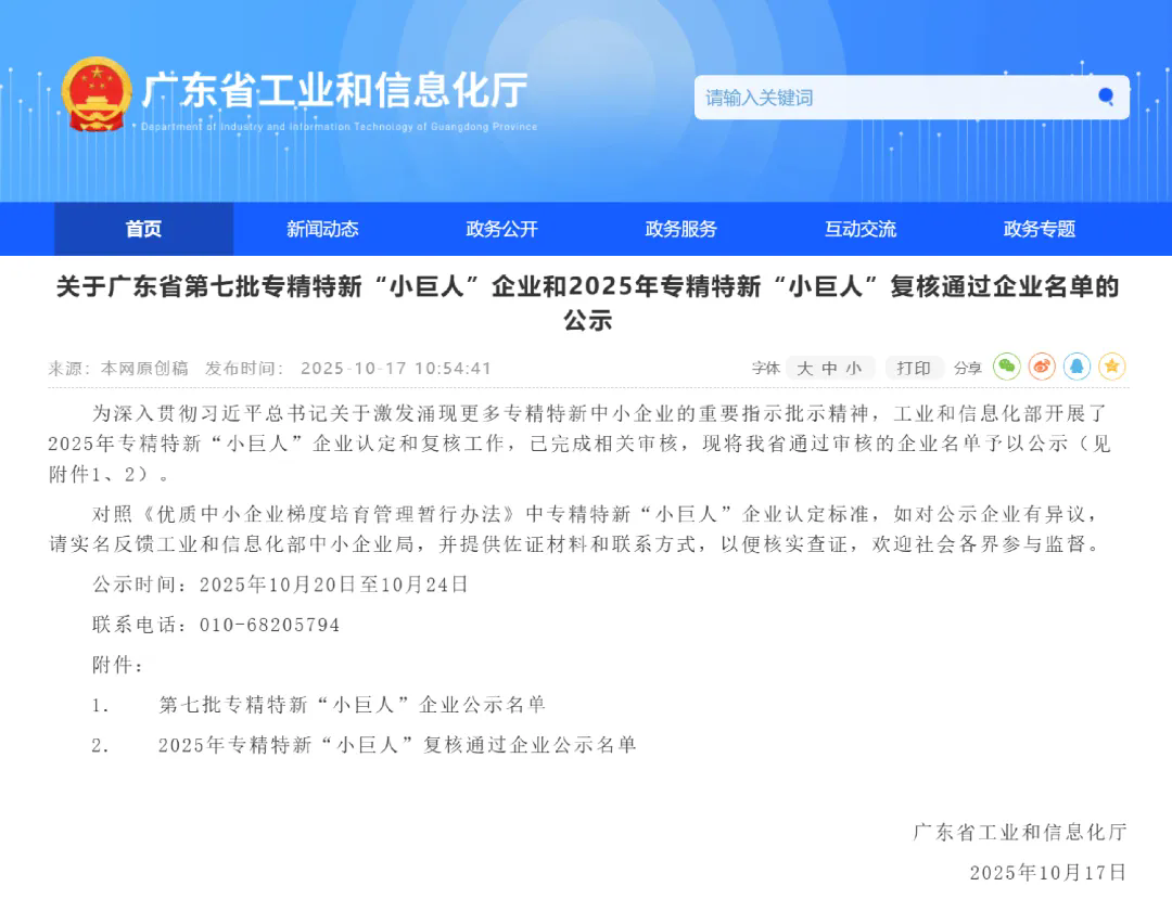 近日,国家工信部公示《第七批专精特新“小巨人”企业和2025年专精特新“小巨人”复核通过企业名单》,广东睿智环保科技股份有限公司成功登榜。